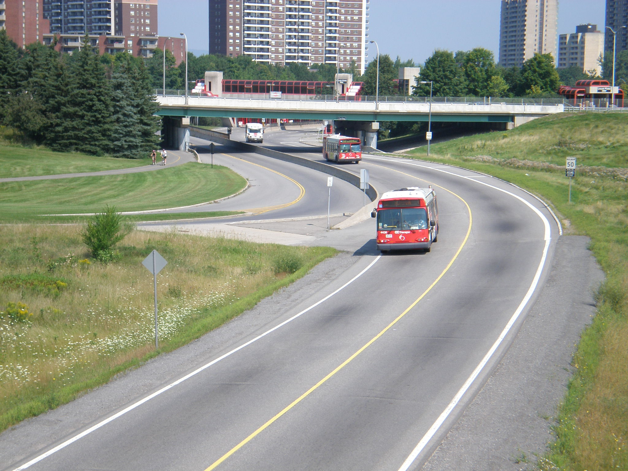 OC Transpo (New Flyer D60LF) at St-Laurent Transitway Station Operating Route 95: Trim-Barrhaven Centre (2006)The Transitway was a Bus Rapid Transit (BRT) network made up of bus-only rights-of-way. This essentially established a highway network exclusive to OC Transpo buses with stations, known as Transitway stops, serving commuters. With the first segment opening in 1983, a fraction of its prime still remains today.