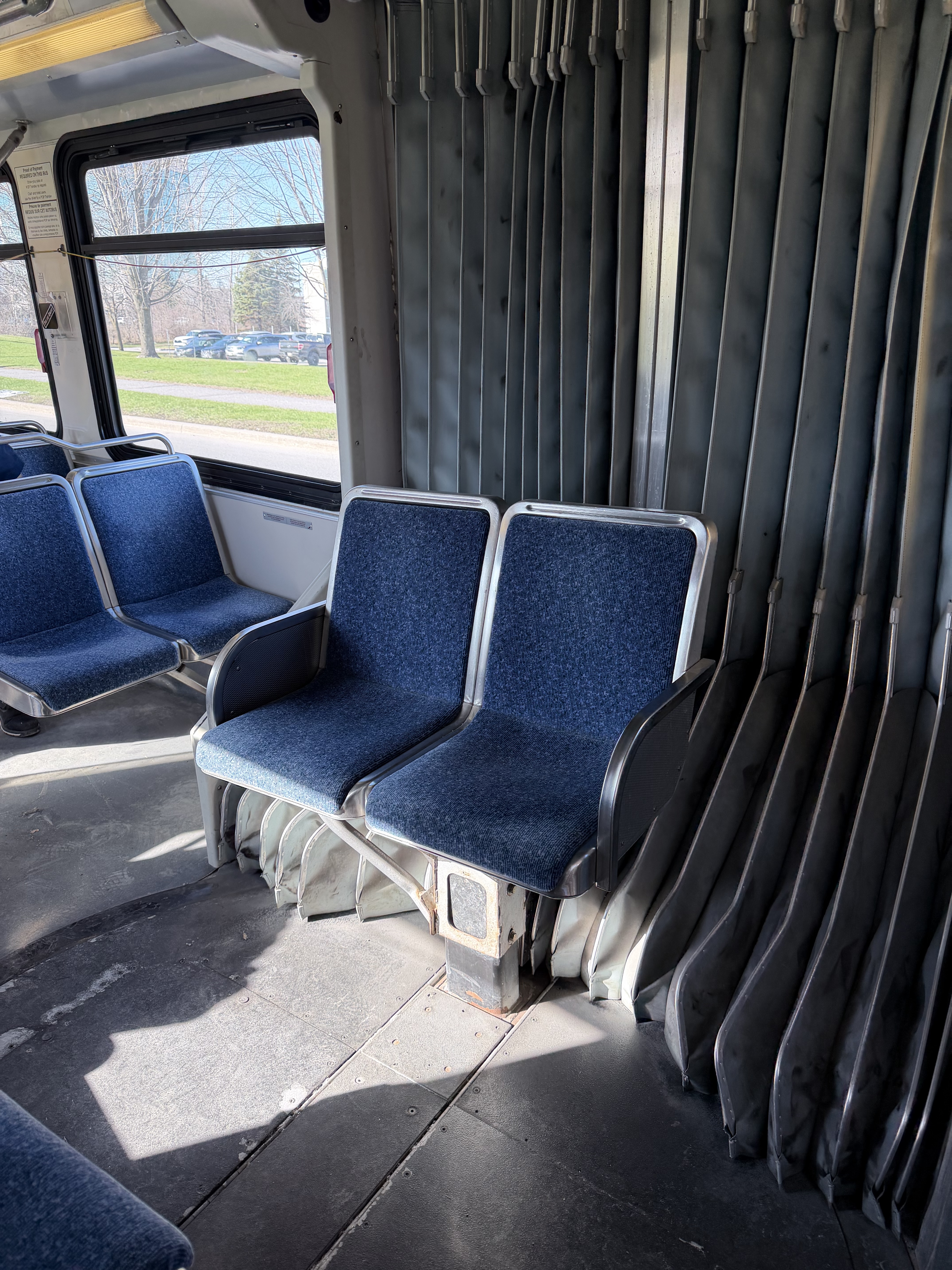 OC Transpo 6579 (2011 New Flyer D60LFR) Operating Route 14: Carlington (2015)Within the interior, there’s a specific set of seats positioned in the middle at the “accordion” of the articulated bus. Due to the nature of articulated buses, the connecting flexible bellows (accordion) section goes through some aggressive bumps and bends, I call it the “rollercoaster” seat. Sitting here feels like you’re riding a rollercoaster and about to fall off — yes, it can sometimes get you nauseous too.